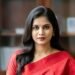 A couple with the same face as reference image. The girl in a wine-red silk saree turns slightly toward the camera with a soft smile, holding her pleats as her pallu moves in the breeze. The boy in a simple white kurta with shawl stands behind her, slightly blurred but smiling faintly. Warm golden hour glow highlights their identical faces, evoking a nostalgic 90s film still.