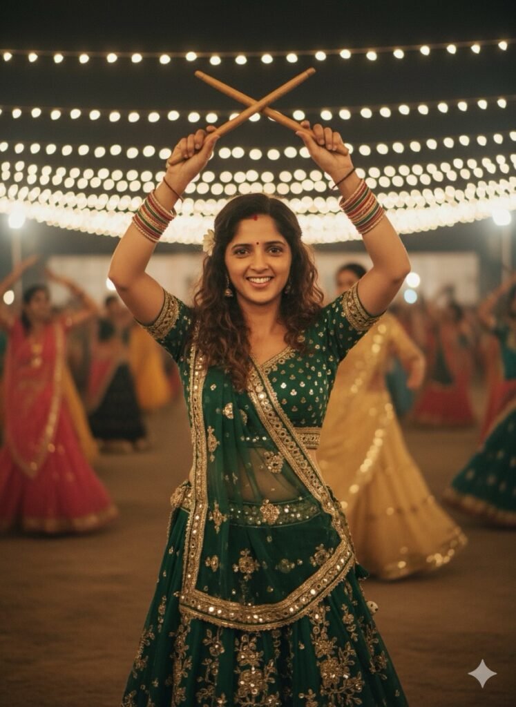 Create a retro vintage but bright cinematic image of the reference picture dressed in a traditional Gujarati lehenga in deep green with golden embroidery, paired with a short-sleeved choli and a flowing golden dupatta. She is standing in a playful garba pose with two dandiyas raised above her head, crossing diagonally, smiling softly. Her long hair flows naturally with a slight curl, adorned with a small golden flower. Background: a crowded open ground at night with groups of people playing garba in circular formations, fairy lights strung above, soft wind moving the dupatta. Lighting is dramatic with glowing contrasts, creating a dreamy Navratri night atmosphere. Keep her exact same face and expression with 100% accuracy.