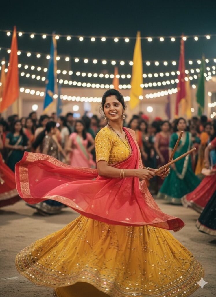 Create a retro vintage but bright image of the reference picture in a mustard yellow lehenga with subtle mirror work, paired with a rich red dupatta flowing dramatically in the wind. She is captured mid-twirl with dandiyas in both hands, her bangles glistening in the light, hair cascading long and romantic. The background is an open Navratri ground decorated with colorful flags, lanterns, and dancers moving in rhythm under the night sky. The entire scene feels cinematic like a 90’s Bollywood Navratri song. Keep her exact same face and expression with 100% accuracy.