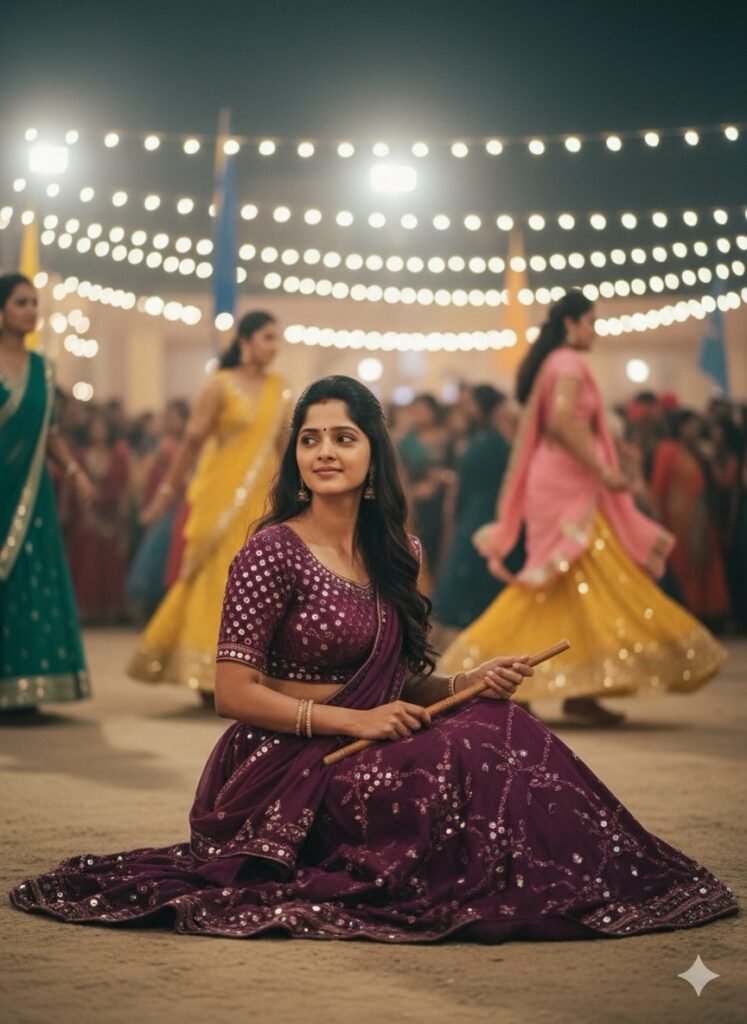 Create a retro vintage but bright and dreamy image of the reference picture in a royal purple lehenga with mirror embroidery and a matching blouse, sitting gracefully on the floor in a soft side pose with dandiyas resting on her lap. She is smiling gently while looking sideways, her hair curled with a delicate flower tucked into the locks. The background shows dancers blurred in motion, bright spotlights glowing, and the contrast of night ambiance against festival lights. Romantic and aesthetic with soft windy details. Keep her exact same face and expression with 100% accuracy.