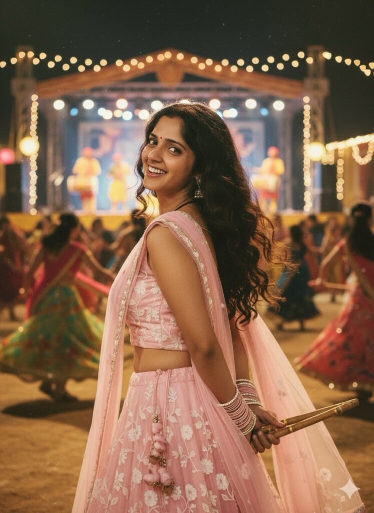 Create a retro vintage but bright Navratri image of the reference picture in a soft pink lehenga with delicate white embroidery, sleeveless blouse, and a lightweight dupatta. She is captured in a side pose looking over her shoulder with a playful smile, dandiyas hidden behind her back, bangles shining softly. Her long curls catch the breeze, soft glow on her face. Background: a decorated festival ground with colorful lights, drummers on stage, and garba dancers blurred in motion. Dreamy romantic vibe like a 90’s movie scene. Keep her exact same face and expression with 100% accuracy.