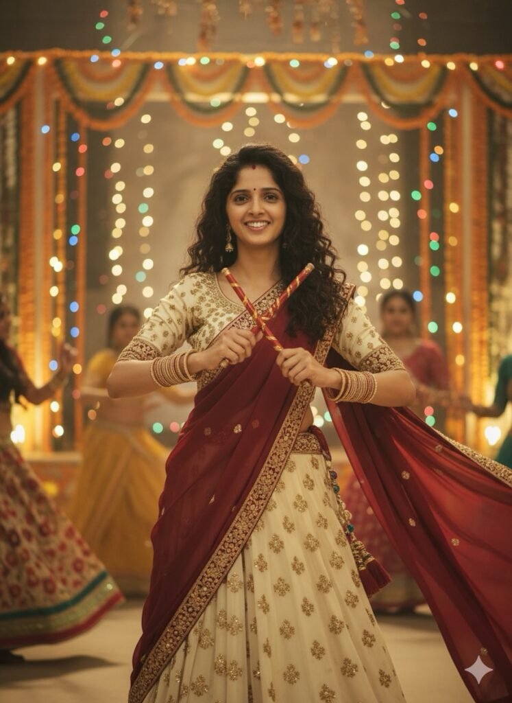 Create a retro vintage but bright cinematic image of the reference picture in a cream lehenga with maroon borders and heavy embroidery, paired with a maroon dupatta flowing gracefully. She is standing in a graceful posture with dandiyas crossed near her chest, smiling warmly. Her long curls and bangles shine in the ambient light. Background: a garba stage decorated with marigold flowers, colorful fairy lights, and groups of dancers blurred in motion. The vibe is aesthetic, devotional, and festive. Keep her exact same face and expression with 100% accuracy.
