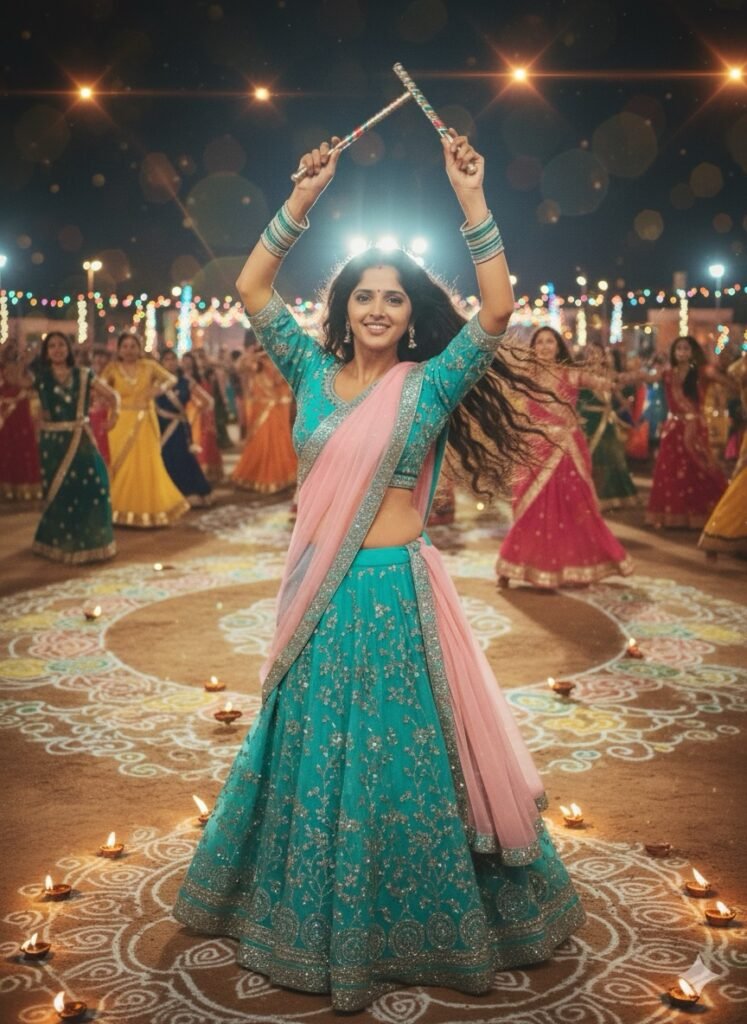 Create a retro vintage but bright cinematic image of the reference picture in a turquoise lehenga with silver embroidery paired with a soft pink dupatta. She is captured mid-dance with both hands lifted high, holding dandiyas that glisten under the spotlights, her hair flowing freely in the wind. Bangles sparkle as she moves. Background: decorative rangoli patterns glowing on the ground, surrounded by dancers and lamps, with the night sky adding depth. Magical and festive. Keep her exact same face and expression with 100% accuracy.