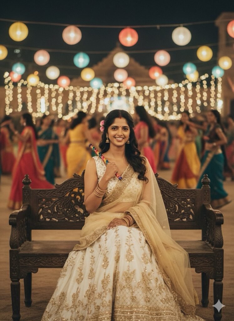 Create a retro vintage but bright Navratri image of the reference picture in a white lehenga with golden embroidery and a sheer golden dupatta draped elegantly. She is sitting gracefully on a decorated wooden bench, holding one dandiya resting lightly on her shoulder while smiling softly. Her bangles shimmer and hair curls gently with a tucked flower. Background: lanterns hanging above, dancers in soft-focus, fairy lights glowing in the night wind. Romantic, dreamy, and filmy. Keep her exact same face and expression with 100% accuracy.