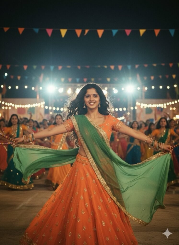 Create a retro vintage but bright cinematic image of the reference picture in a vibrant orange lehenga with intricate embroidery paired with a green dupatta. She is standing in a dance-ready posture with both hands extended sideways, holding dandiyas as if about to strike. Her bangles shimmer under festival lights, long hair swaying in the wind. Background: a large garba crowd with colorful flags, stage lights glowing, and the night sky full of energy. Windy, dramatic, and festive. Keep her exact same face and expression with 100% accuracy.