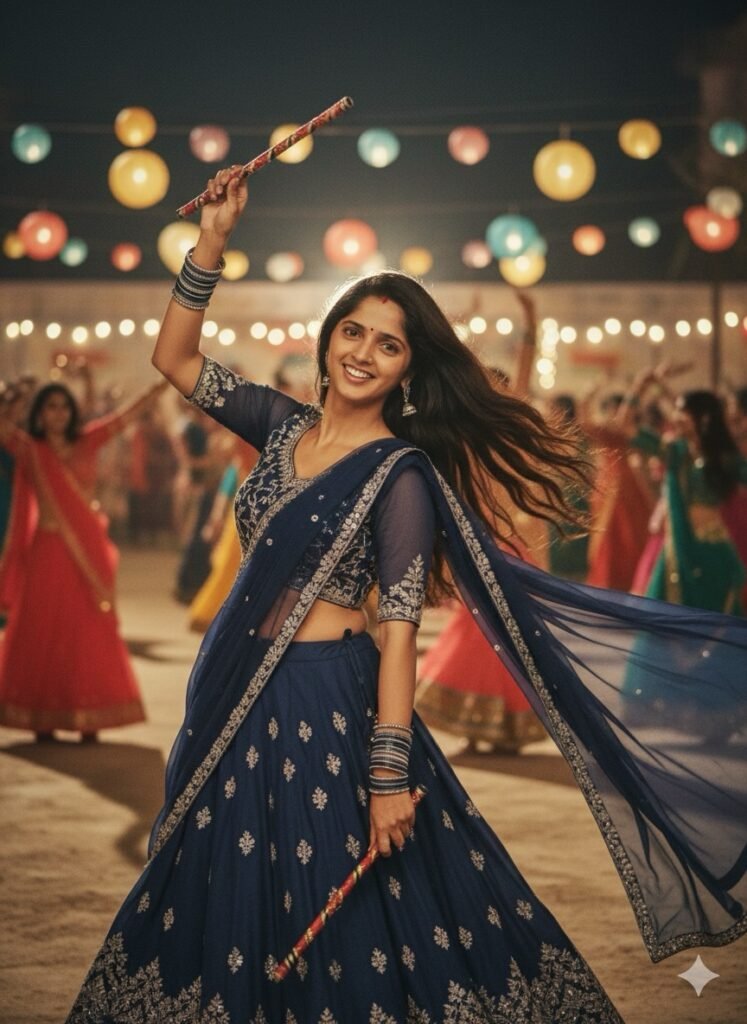 Create a retro vintage but bright cinematic image of the reference picture in a navy blue lehenga with silver embroidery and a flowing chiffon dupatta. She stands in a playful stance holding one dandiya raised upwards and the other angled down, body slightly tilted, smiling softly. Her long hair sways with the breeze, bangles catching the light. Background: a festive ground with people dancing in circles, colorful lanterns hanging, warm glowing spotlights creating shadows and depth. Aesthetic retro Navratri drama. Keep her exact same face and expression with 100% accuracy.
