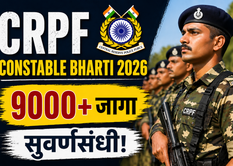 भारतामधील तरुणांसाठी सरकारी नोकरी मिळवण्याची मोठी संधी म्हणजे CRPF Constable Bharti 2026. केंद्रीय राखीव पोलीस दल (CRPF) कडून टेक्निकल, ट्रेड्समन आणि पायोनियर पदांसाठी मोठी भरती जाहीर करण्यात आली आहे. या भरतीत 10वी पास उमेदवारांनाही अर्ज करता येतो.