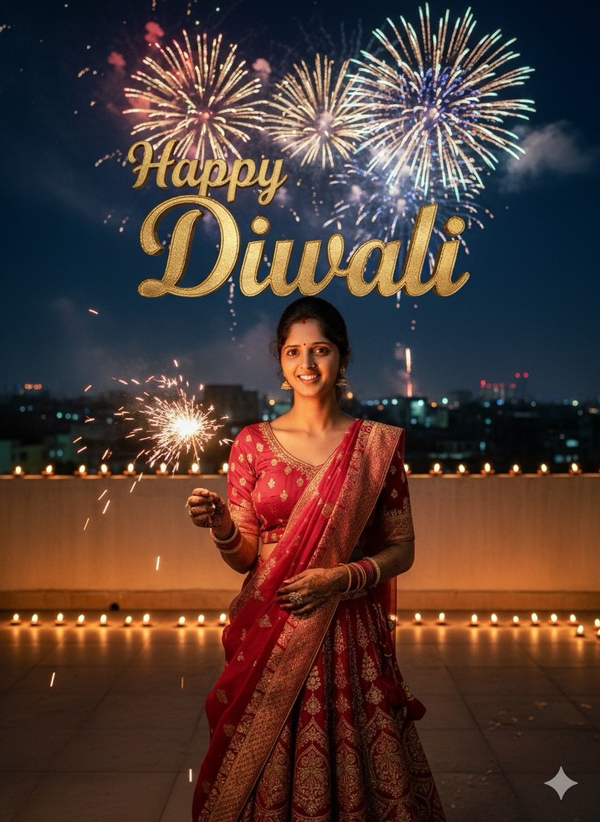 Ultra realistic 4K cinematic portrait of a beautiful young woman with the same reference face, standing on a terrace at Diwali night. She is wearing a deep red lehenga with golden embroidery and a matching dupatta draped over her shoulder. She holds a lit phooljhadi in one hand while smiling warmly, the terrace wall lined with glowing diyas and the night sky filled with fireworks. Metallic golden text in background reads Happy Diwali.