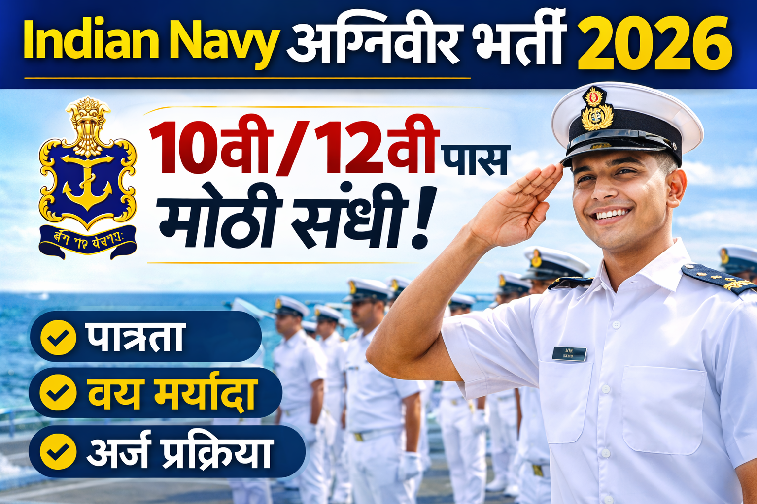 Indian Navy Agniveer Bharti 2026 ही तरुणांसाठी भारतीय नौदलात सामील होण्याची मोठी संधी आहे. 10वी आणि 12वी पास उमेदवारांसाठी ही भरती विशेष महत्त्वाची आहे. इच्छुक उमेदवारांनी पात्रता तपासून शेवटच्या तारखेपूर्वी अर्ज करावा.