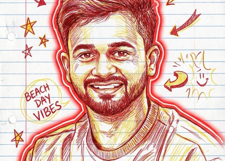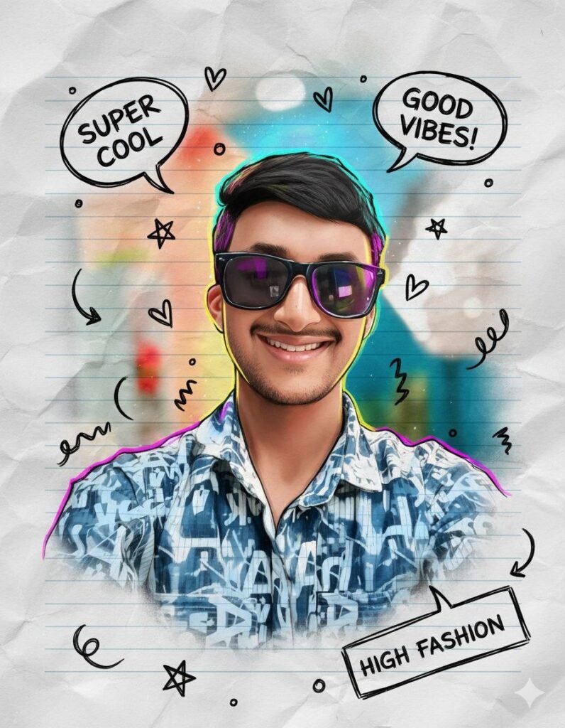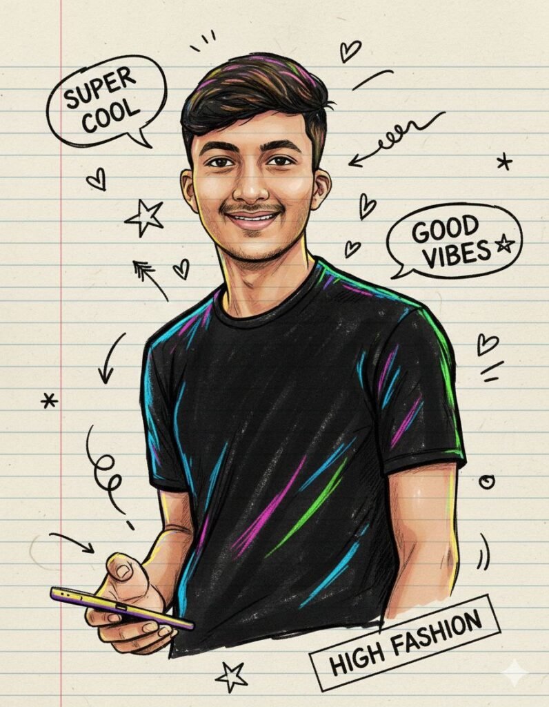 Transform the subject of the input image into a highly detailed digital illustration on a lined notebook paper background. The style must combine realistic shading with thick black pen outlines, resembling a detailed character sketch drawn in a sketchbook. Include random, hand-drawn doodle elements like hearts, stars, and arrows, along with several handwritten speech bubbles or text annotations floating around the subject (e.g., ‘SUPER COOL’, ‘VIBES’, ‘HIGH FASHION’). Use a vibrant, high-contrast color palette to fill in the clothes and accessories, while maintaining the texture of the paper beneath the drawing. Stylized sketch aesthetic.