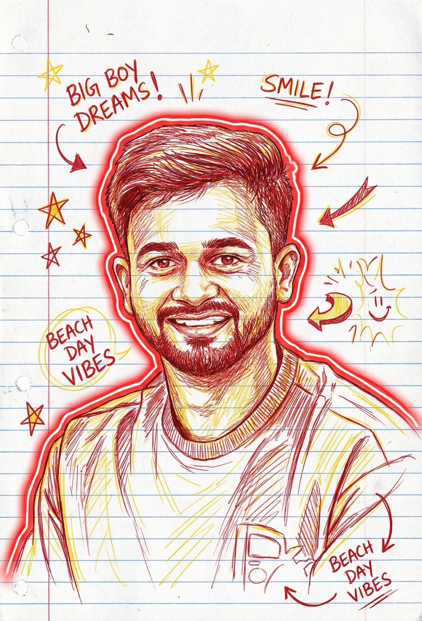 Transform the subject of the input image into a highly detailed digital illustration on a lined notebook paper background. The style must combine realistic shading with thick black pen outlines, resembling a detailed character sketch drawn in a sketchbook. Include random, hand-drawn doodle elements like hearts, stars, and arrows, along with several handwritten speech bubbles or text annotations floating around the subject (e.g., ‘SUPER COOL’, ‘VIBES’, ‘HIGH FASHION’). Use a vibrant, high-contrast color palette to fill in the clothes and accessories, while maintaining the texture of the paper beneath the drawing. Stylized sketch aesthetic.