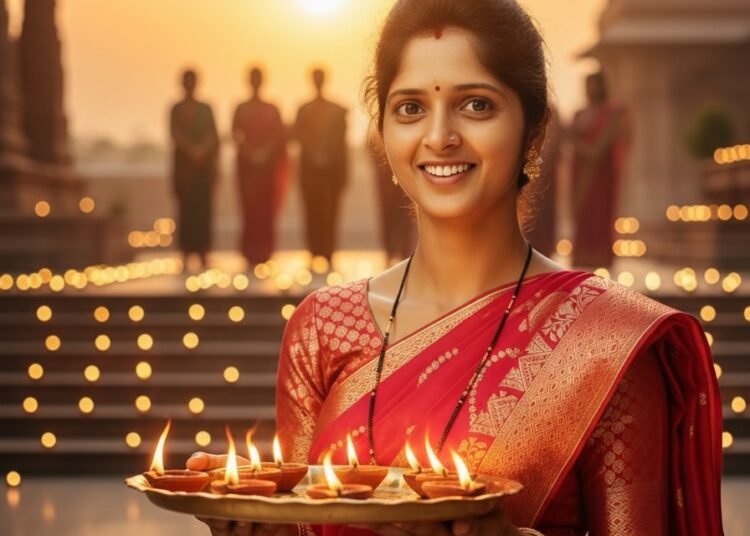 “Generate a realistic 8K Navratri photo of the same woman. She is in a red silk saree with golden zari border. Same posture and smile. The background is an outdoor temple courtyard at sunset, with diyas placed in rows and devotees preparing for evening aarti. Warm glowing light, cinematic clarity, festive devotion.”